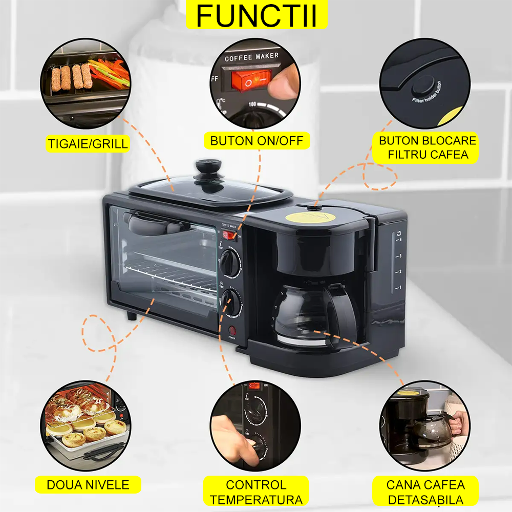Această capodoperă culinară este echipată cu tot ce ai nevoie pentru a găti rapid și ușor micul dejun perfect: de la prăjitorul de pâine, la cafetieră și funcția de gril, totul într-un singur aparat!