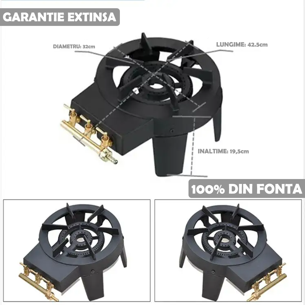 Se conecteaza la orice tip de butelie si poti controla puterea focului cu ajutorul celor 3 robineti si a celor 2 arzatoare.