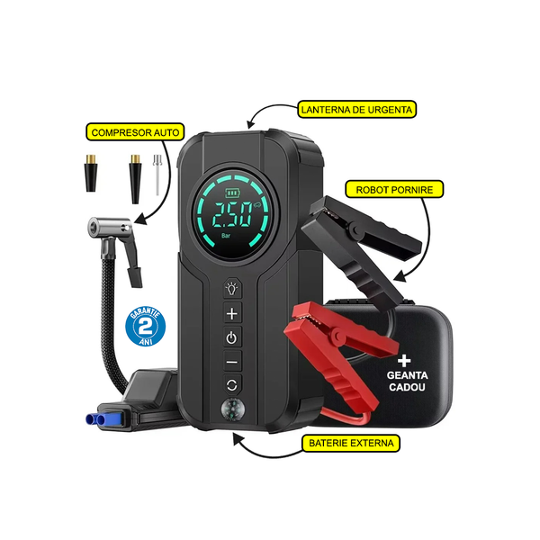 Unealta 4in1: Robot de pornire AUTO, compresor portabil, lanterna de avertizare si baterie externa