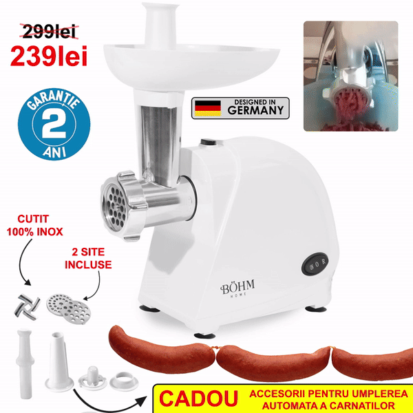 - Motor protejat la supraincalzire - sistemul va intrerupe in mod automat alimentarea cu energie electrica a masinii de tocat.