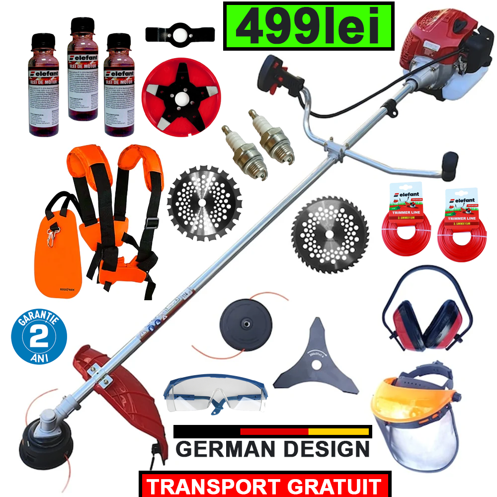 Pe langa garantia de 2 ANI + SERVICE GRATUIT in caz de defect, motocoasa include si 🎁MEGA PACHET cu 16 accesorii CADOU: Ham profesional, 3 sticluțe ulei amestec, Disc pentru plivit, Disc tăietor 20T, Disc 40T, Disc 3T, 2 X bujii, 2 x fir tambur, Cap mosor, Căști, Ochelari, Masca