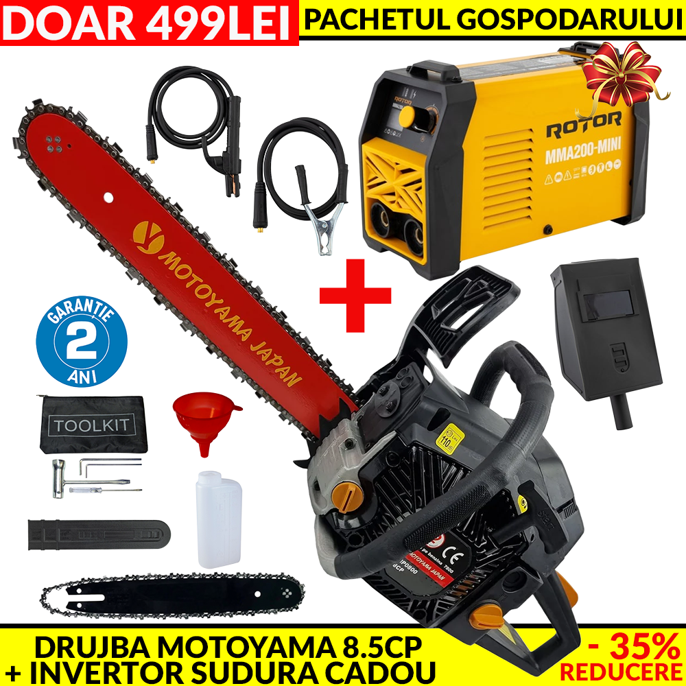 MEGA Pachet: Drujba pe Benzina Motoyama Japan 8.5CP + Invertor de Sudura LCD Color Rotor MMA200-MIN