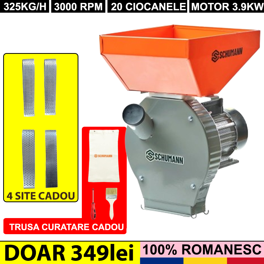 Moara electrica (2 in 1) SCHUMANN 3.9 KW are o capacitate de macinare de 325kg/ora, fiind ideala pentru a macina toate tipurile de CEREALE cum ar fi : cereale, grau, porumb, secara, soia, etc. cat si stiuleti de porumb intregi, pentru obtinerea de uruiala pentru hrana animalelor sau a pasarilor. Cu moara electrica (2 in 1) Schumann 3.9 kw se poate obtine uruiala, crupe, malai etc.