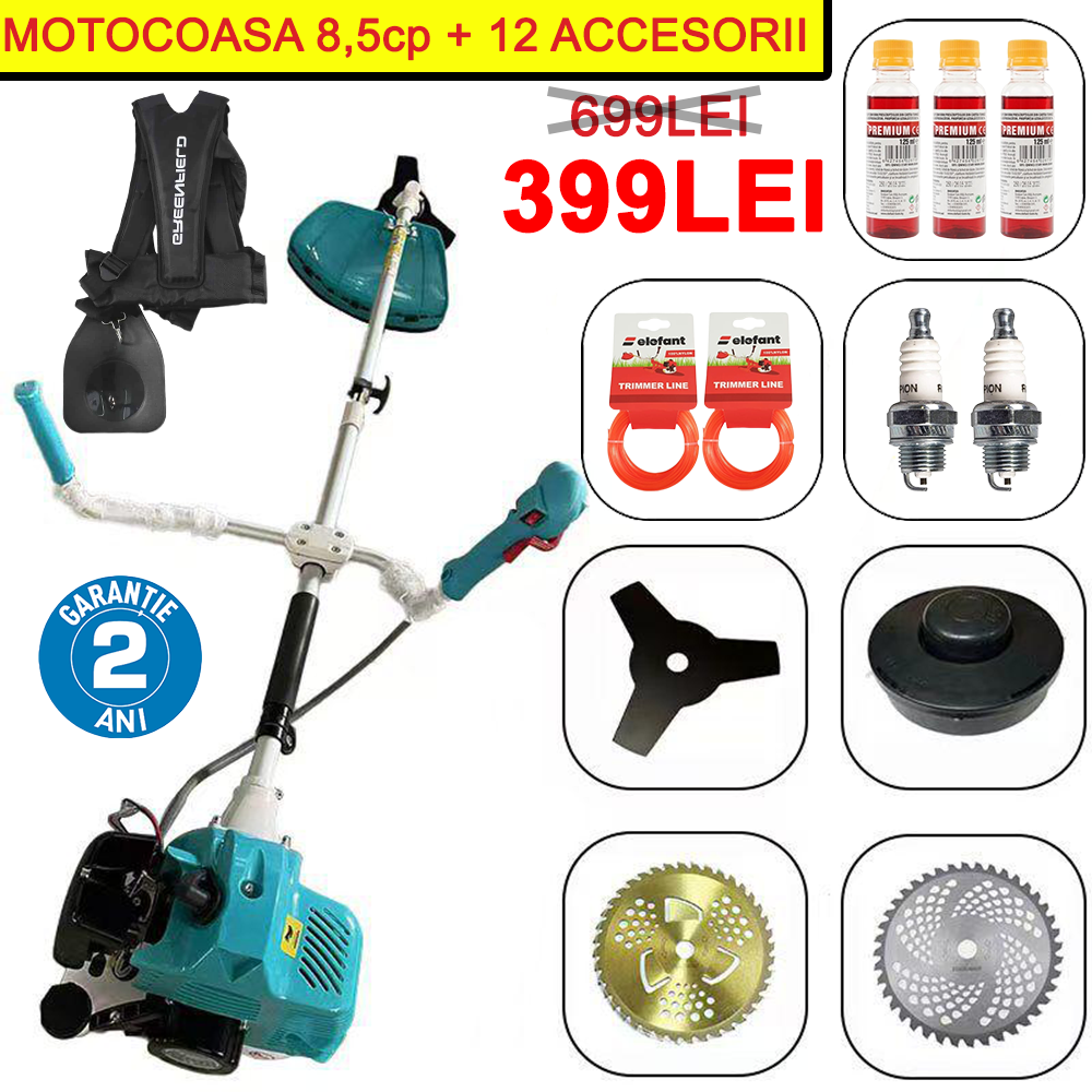 Aceasta motocoasa cu motor pe benzina are o putere de 8.5 cai putere si functioneaza cu un sistem de 2 timpi, ceea ce o face ideala pentru taieri si cosit vegetatie densa si inalta.Setul include trei accesorii esentiale: Ham profesional, 3 sticluțe ulei amestec, Disc 3T, Cap mosor, 2 Role fir tambur, 2 Bujii de rezerva, Disc 40T, Disc 40T Auriu, pentru a-ti oferi flexibilitate si versatilitate in utilizarea acestei motocoase.
