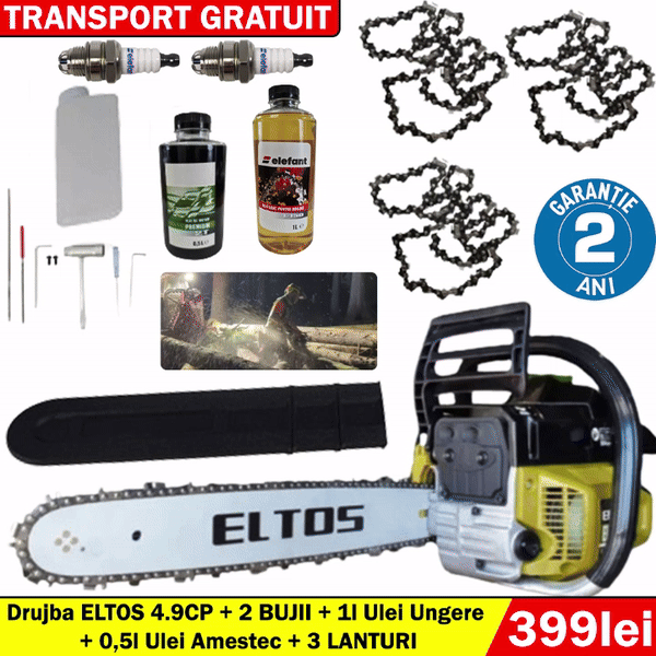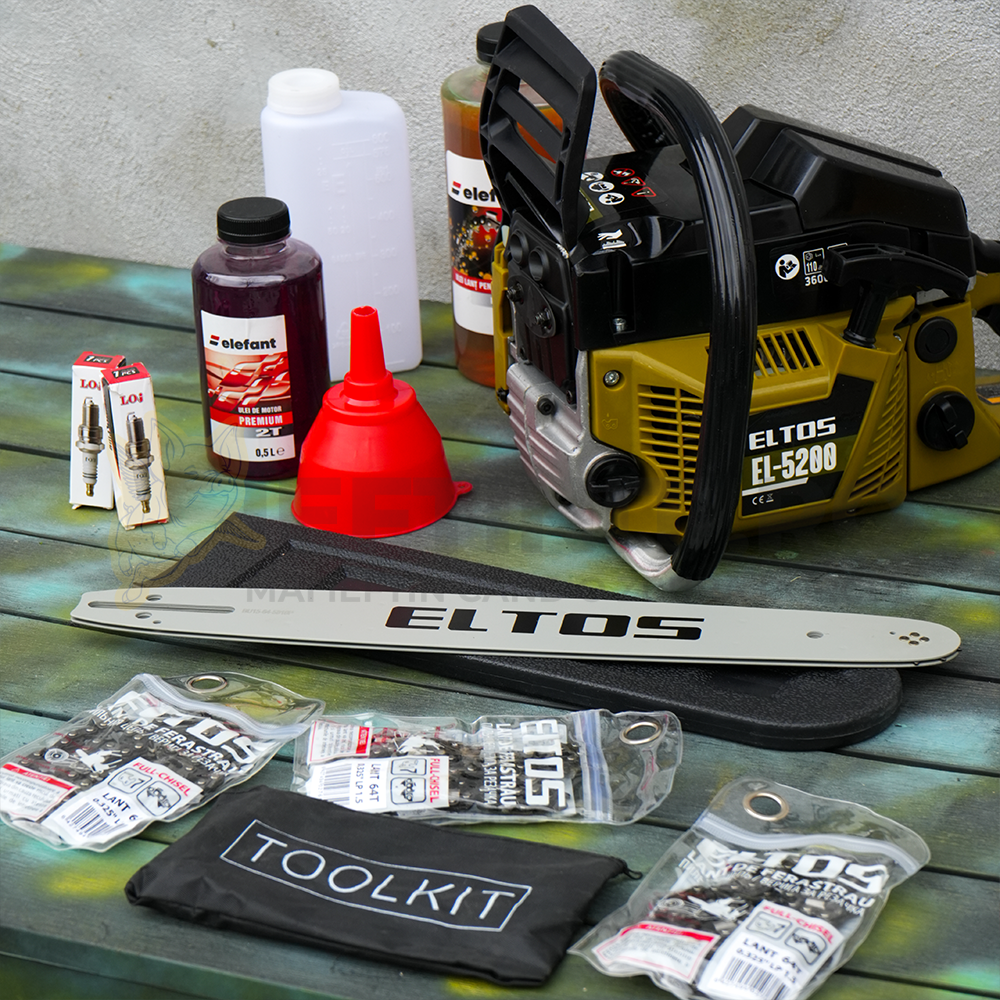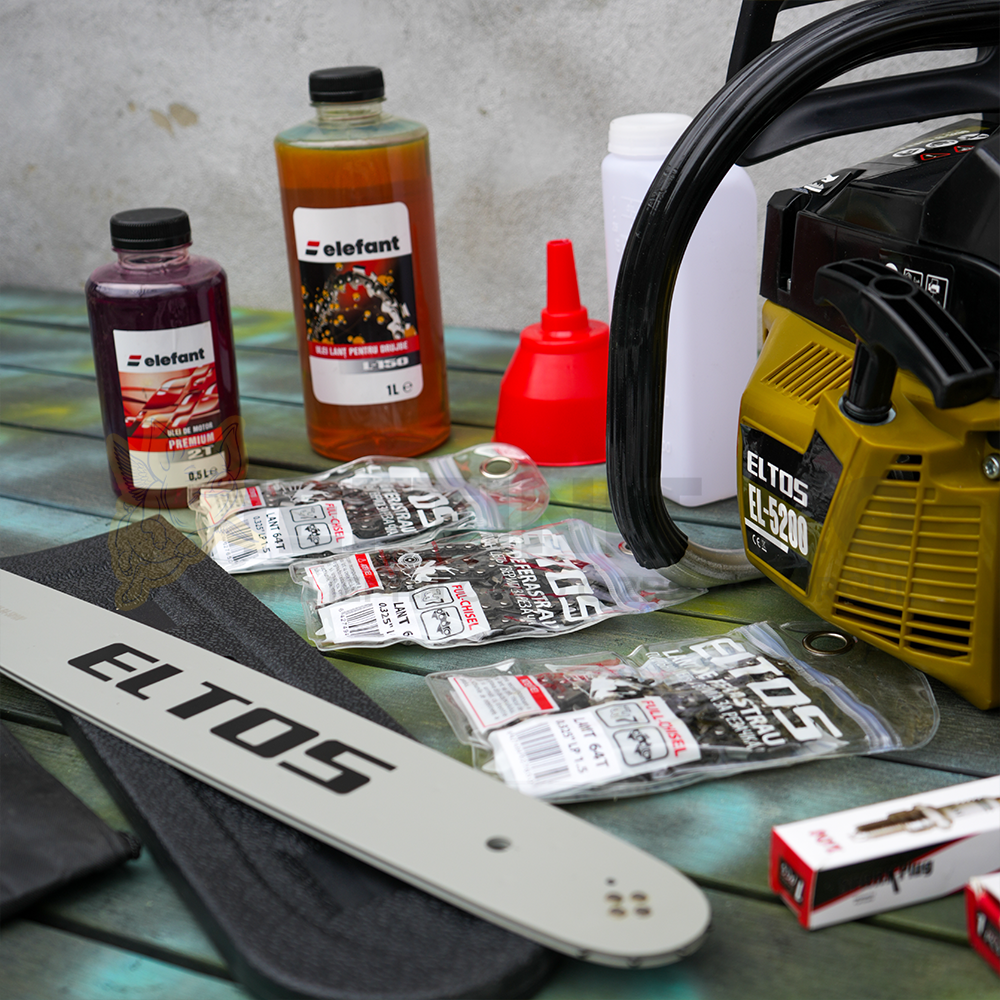 ➡️Continut pachet: Drujba Eltos E5200 + 2 bujii de rezerva + 3 lanturi (325 1.5 64) + 1 litru de ulei pentru ungere + 0,5l ulei amestec pentru motor in 2 timpi + mini trusa de scule + protectie lama