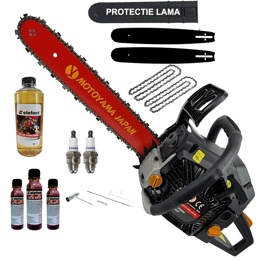 Pachet Promo: Drujbă pe benzină MOTOYAMA JAPAN – 8,5 CP, 2 lame, 2 lanțuri și consumabile
