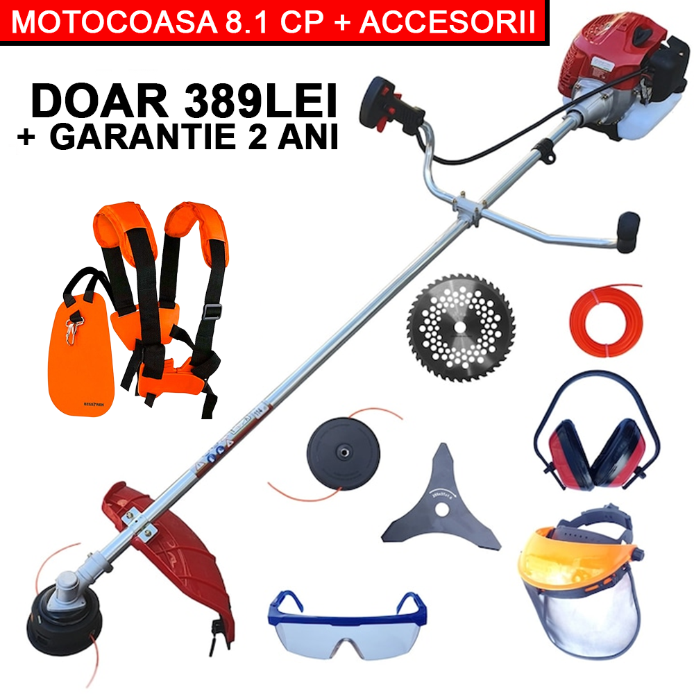 Aceasta motocoasa cu motor pe benzina are o putere de 8.1 cai putere si functioneaza cu un sistem de 2 timpi, ceea ce o face ideala pentru taieri si cosit vegetatie densa si inalta.Setul include trei accesorii esentiale: Cap Mosor cu Fir Tambur, Disc 40T, Disc 3T, Ham Profesional, Fir Stea de Rezerva, Masca de Protecție, Ochelari de protecție, Casti de Protectie, Bidon Pentru Amestec, pentru a-ti oferi flexibilitate si versatilitate in utilizarea acestei motocoase.
