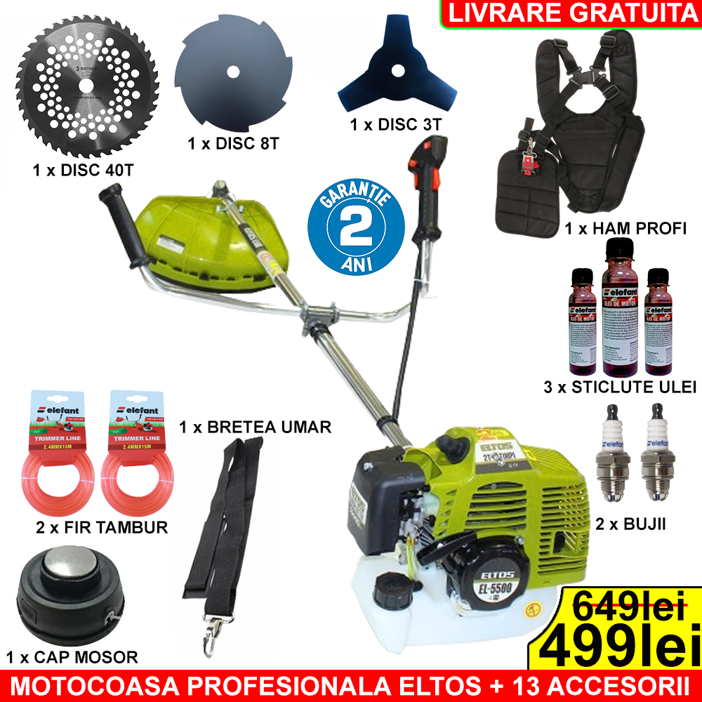 Aceasta motocoasa cu motor pe benzina are o putere de 4.7 cai putere si functioneaza cu un sistem de 2 timpi, ceea ce o face ideala pentru taieri si cosit vegetatie densa si inalta.Setul include trei accesorii esentiale: Disc 3T, Disc 40T, Disc 8T, Cap tambur cu fir, Ham PROFESIONAL, 2 role de fir tambur, 3 sticlute ulei amestec, 2 bujii de rezerva si bidon de amestec, pentru a-ti oferi flexibilitate si versatilitate in utilizarea acestei motocoase.