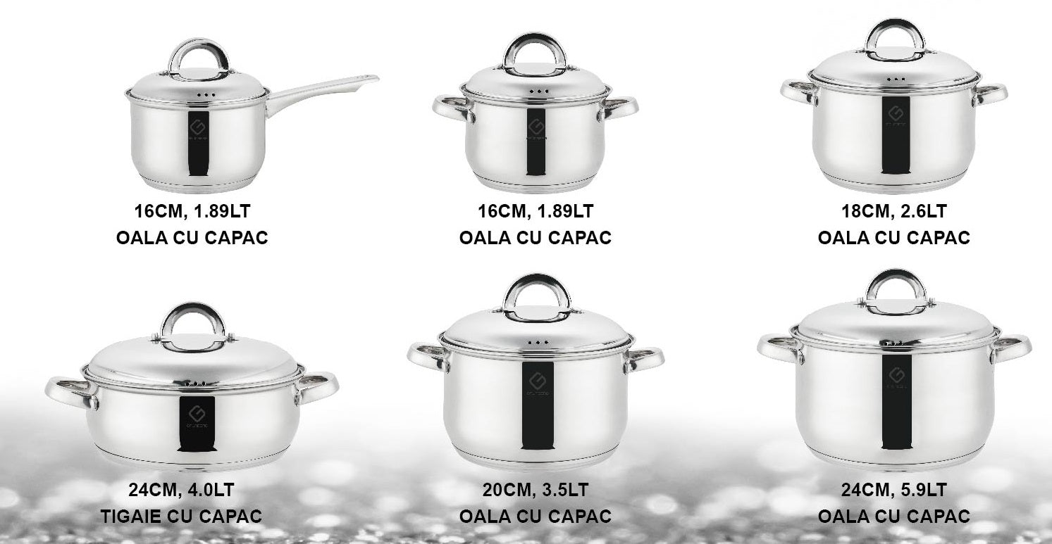Inainte de prima utilizare spalati oalele cu detergent pentru vase si apa calda pentru a va asigura ca nu au mai ramas reziduri din procesul de productie, uscati bine. Inainte de curatare asigurati-va ca s-a racit complet.Daca introduceti oale sau tigai incinse in apa , acestea se pot deforma . Oalele din otel inoxidabil sunt create astfel incat sa reziste in timp la petele de mancare si decolorare ,atunci cand sunt utilizate pentru a gati la foc mic. Pentru indepartarea petelor rezistente, insistati asupra acelei suprafete utilizand un produs de curatare neabraziv .Acest set poate fi curatat si in masina de spalat vase, totusi pot ramane pete de apa daca vor fi uscate la o temperatura mare , de aceea va recomadam sa le scoateti din masina inainte de a incepe procesul de uscare si sa le uscati folosind un prosop de bucatarie .