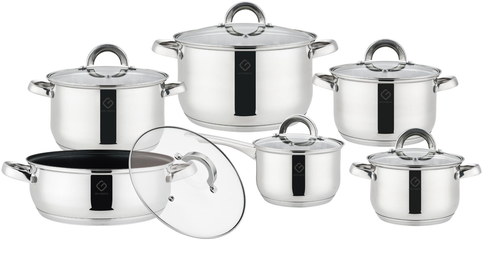 Set 12 piese , 6 vase din inox,compatibile cu plita cu inductie, cu capace din sticla, Grunberg GR1513
