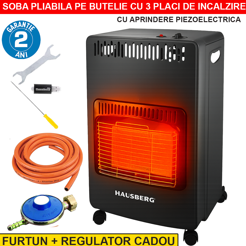 Soba pe gaz GPL Hausberg HB-1021NG este alegerea perfectă pentru locuințe, birouri, case de vacanță sau spații neelectrificate. Pornește instant, încălzește puternic și vine gata de utilizare cu ceas de butelie + furtun incluse!